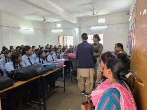 स्वामी आत्मानंद उत्कृष्ट हिंदी माध्यम विद्यालय में आयोजित कार्यक्रम के दौरान प्रभारी थाना चक्रधरनगर उप निरीक्षक गेंदलाल साहू, महिला थाना की सहायक उप निरीक्षक सरस्वती महापात्रे एवं साइबर सेल के प्रधान आरक्षक दुर्गेश सिंह और रेणु सिंह द्वारा छात्राओं को महिला सुरक्षा एवं साइबर जागरूकता के संबंध में विस्तारपूर्वक जानकारी दी गई। इस दौरान छात्राओं को सोशल मीडिया के सुरक्षित उपयोग, ऑनलाइन ठगी, साइबर अपराधों से बचाव, आपात स्थिति में त्वरित सहायता लेने के उपाय तथा महिला सुरक्षा से जुड़े कानूनी प्रावधानों के बारे में भी समझाया गया। इस दौरान महिला थाना की प्रधान आरक्षक प्रमिला महंत, महिला आरक्षक माधुरी राठिया (थाना चक्रधरनगर) भी मौजूद रही ।